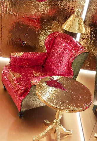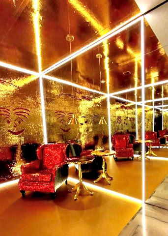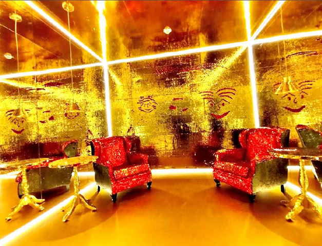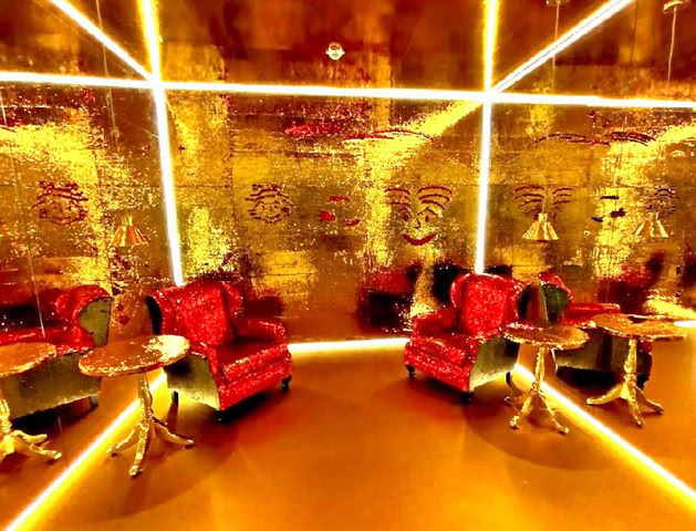 A ambientação reúne espelhos, luminárias, piso vinílico dourado, teto de lantejoulas dourado, duas mesas estilo Chipandelle e um par de poltronas, compondo um cenário criativo, estimulando a imaginação. A visitação segue até 25 de janeiro de 2026.